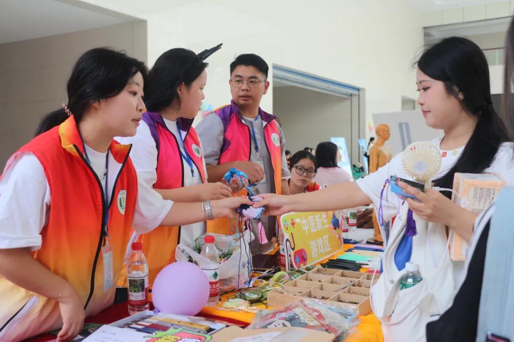 长廊内侧还专门设置了趣味游戏区,新生们兴致勃勃地围拢在各摊位前积极参与。成功通关的同学可领取一份小礼品和学院特别定制的中药香囊——既实用又具纪念意义,让大家在互动中沉浸式体验中医药文化的魅力。