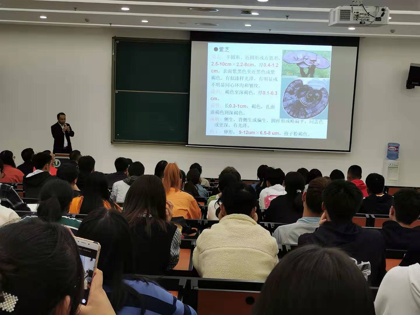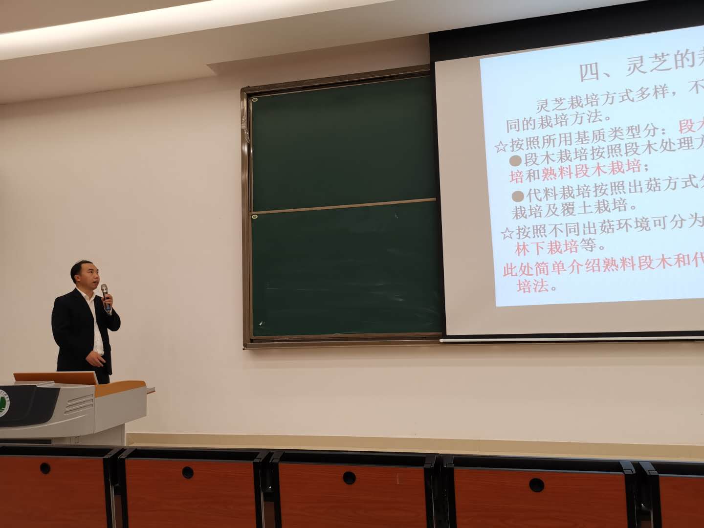 肖波研究员先后介绍了灵芝的基本特性、菌种生产技术、栽培技术、生产管理、加工技术以及灵芝产业健康发展思路,内容充实易懂,对师生具有很高的启发性。肖波研究员还分享了自己从事药用菌物、药用植物组培及其产业化工作中的技术创新和产业化的经验,与师生进行现场交流答疑。