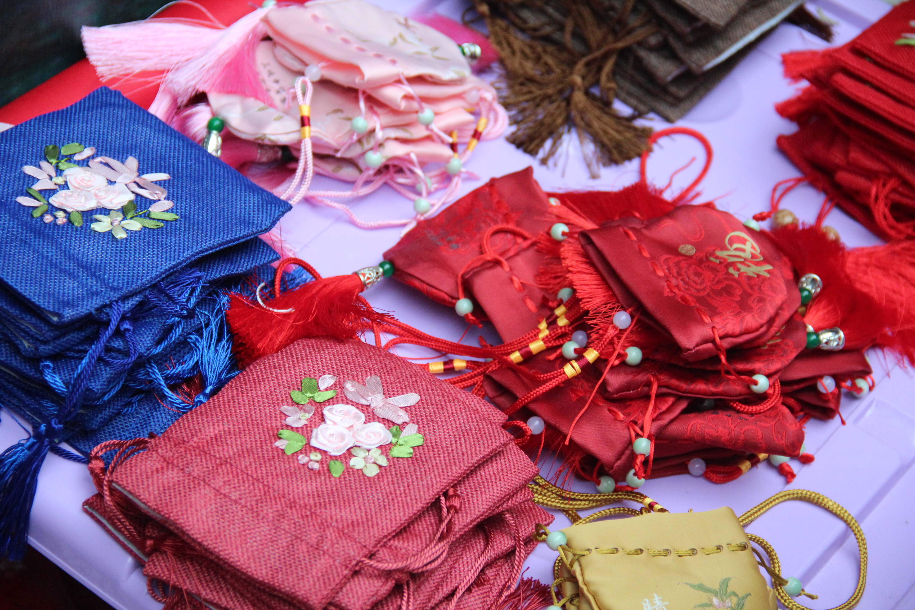 在香囊传情活动区,参与者首先需回答中药香囊与中药防疫的相关知识题目,巩固同学们所学的中医药知识。其次,参与者可以根据香囊配方选择相应的中药饮片,并且现场体验中药粉手工研磨过程。最后,将自己研磨好的药粉装进香囊袋子。制作好香囊后,参与者可以在工作人员提前准备好的小纸条上写下对亲人想说的话,可以是思念,可以是感恩,也可以是祝福,将自己最诚挚的感情装进香囊里送给重要的人。