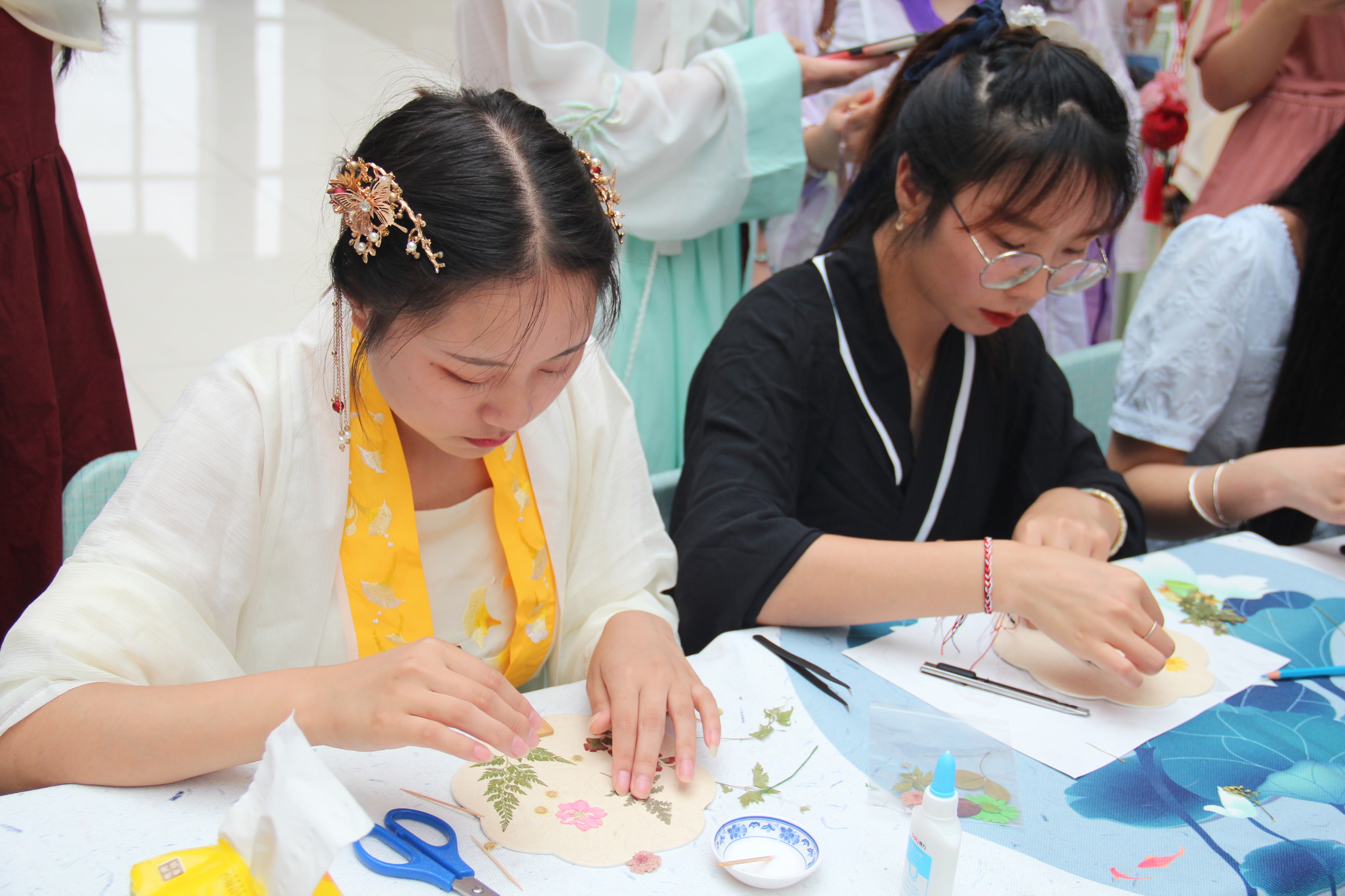 在汉服端午祭活动区,参与者们统一穿着汉民族传统服饰,进行点朱砂,戴五彩绳,诵读《离骚》、《大医精诚》等一系列端午节日礼仪,在仪式感中体会节日氛围,学习中医经典。诵读结束后,大家佩戴香囊,制作花草扇子,在手工制作中学习中医药文化。